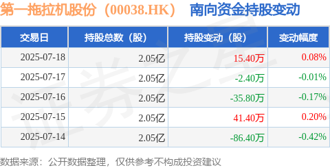 本站消息,7月18日南向资金增持15.4万股第一拖拉机股份(00038.HK)。近5个交易日中,获南向资金减持的有3天,累计净减持67.8万股。近20个交易日中,获南向资金减持的有12天,累计净减持550.53万股。截至目前,南向资金持有第一拖拉机股份(00038.HK)2.05亿股,占公司已发行普通股的52.32%。